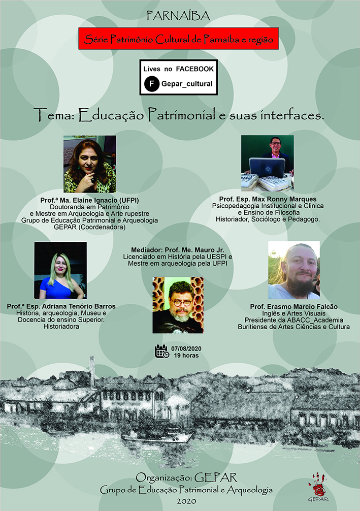 No dia 7 de agosto, foi transmitida, via Facebook, a primeira live do Grupo de Educação Patrimonial e Arqueologia voltada à série “Patrimônio cultural de Parnaíba e região”. O tema escolhido para esse primeiro encontro virtual do grupo foi “Educação patrimonial e suas interfaces” e contou com a participação dos professores Elaine Ignacio (coordenadora do GEPAR), Max Ronny Marques, Adriana Tenório Barros, Erasmo Marcio Falcão e foi mediada pelo também professor Mauro Jr.