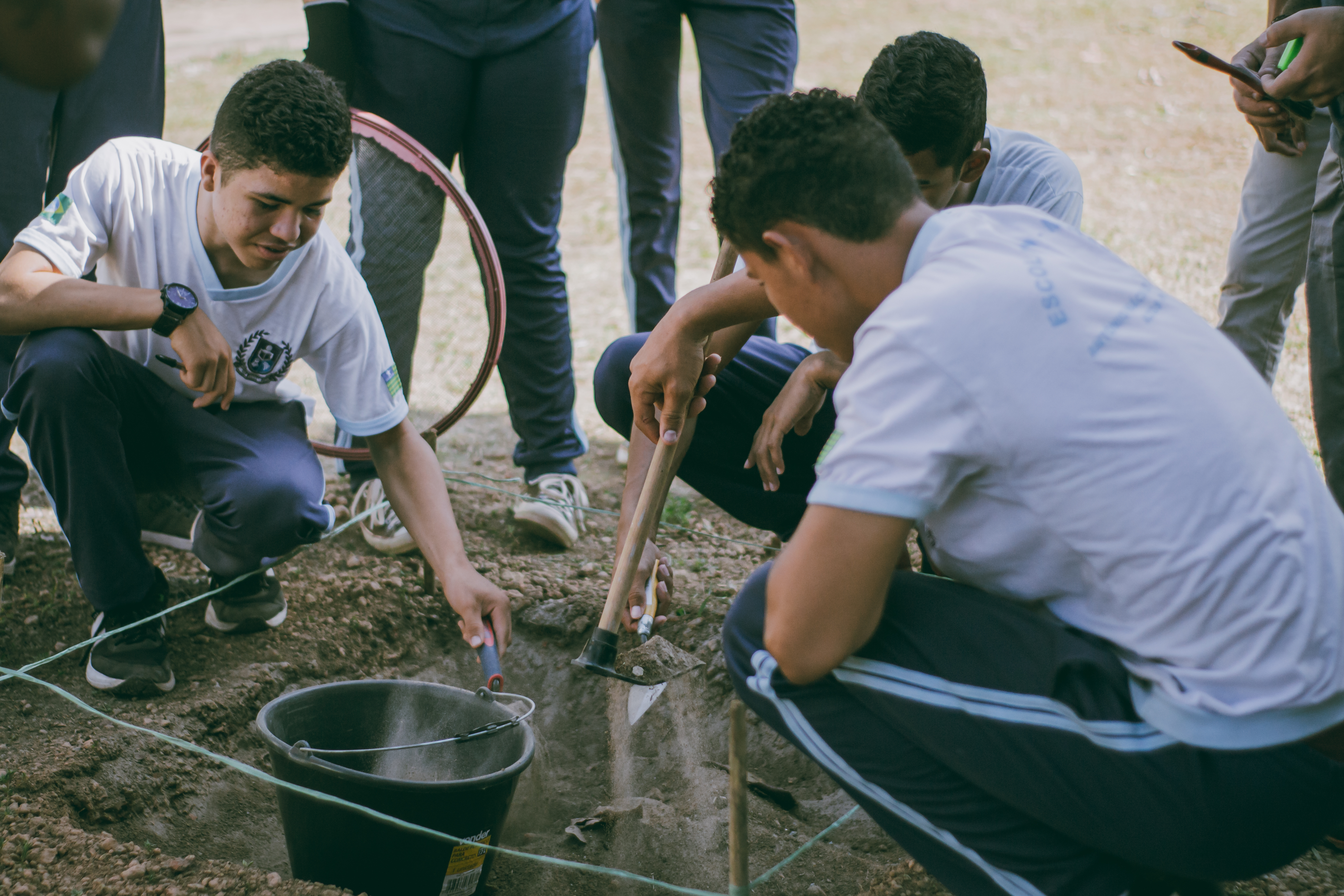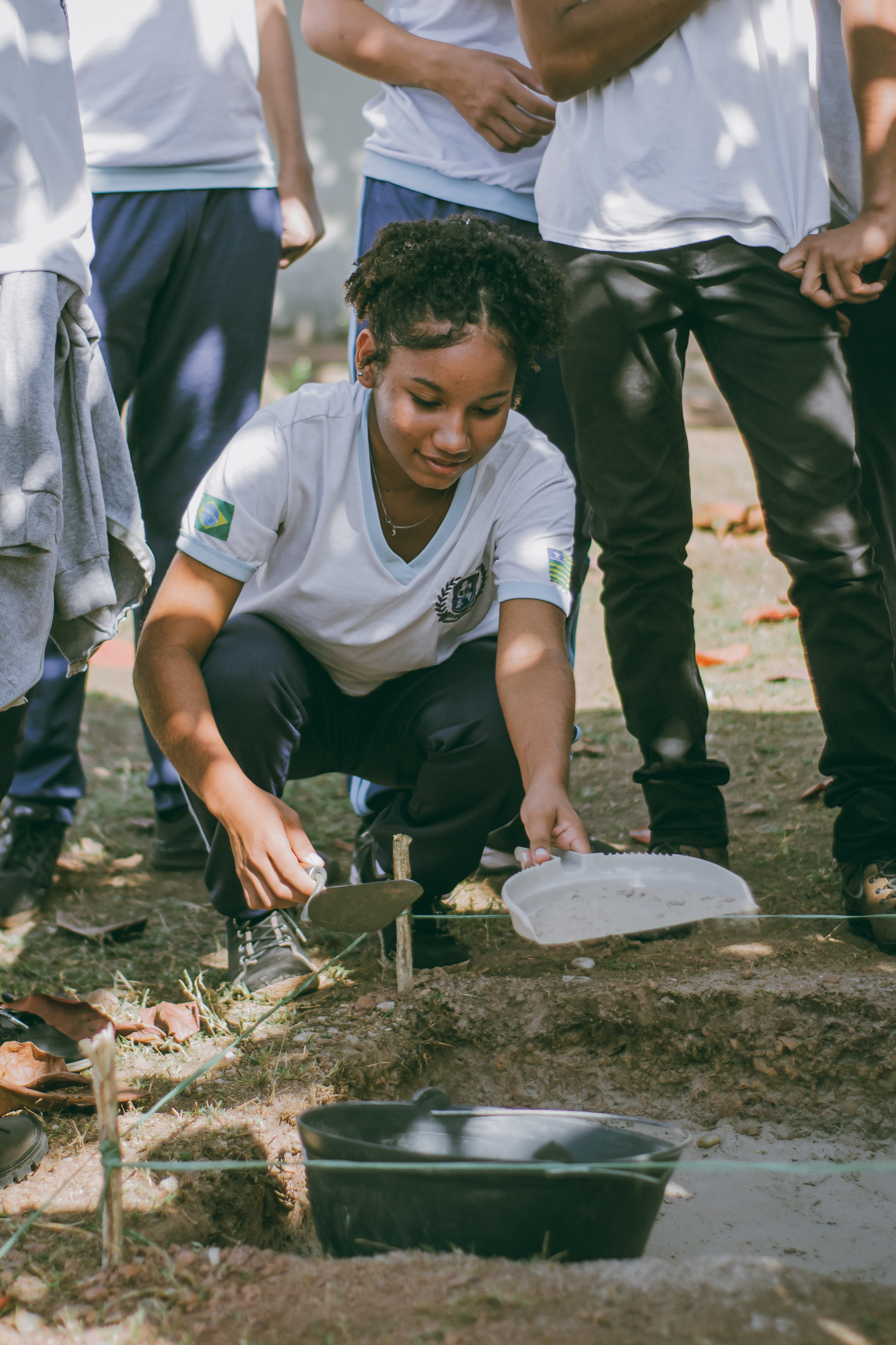 A jornada matinal iniciou-se com uma escavação, onde os alunos do 9º ano foram guiados por membros e parceiros do GEPAR em uma experiência prática da metodologia arqueológica. Divididos em três equipes, coordenadas pelos próprios alunos do grupo, os jovens arqueólogos exploraram a terra em busca de artefatos que pudessem revelar segredos enterrados no solo da escola.